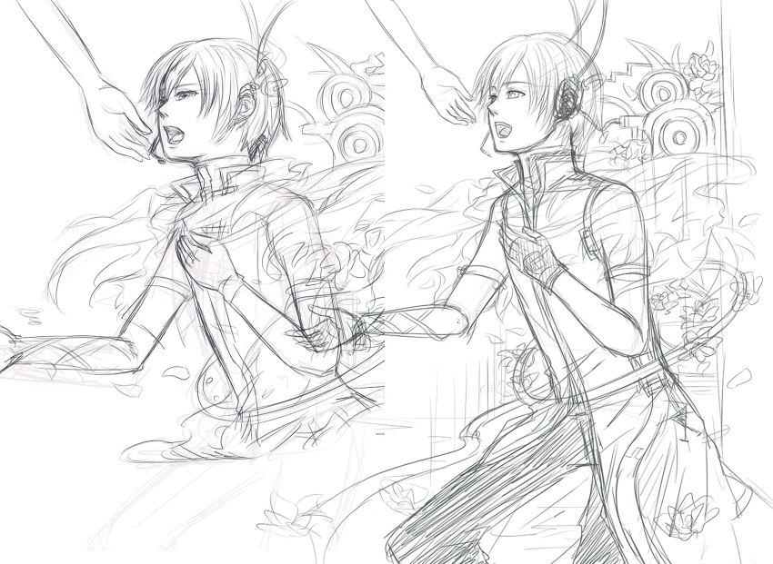 花のイメージは最初に浮かんで、それから適当に描いていくうちにアペンドっぽくしようとしてこんな風にw右の絵はラフと下書きですが、毎度毎度汚くてすいません(;´∀`)