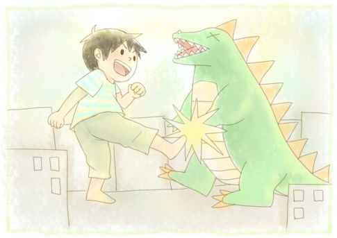子供の夢って何だろうと考えたら、やっぱりヒーローは外せないかなとw適当に描いた割りに怪獣がそれっぽくなってよかったです^^